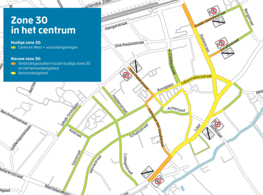 Vanaf zondag 1 september geldt een maximumsnelheid van 30 kilometer per uur in het kerngebied van het Centrum. De gemeenteraad besliste op 27 mei over de snelheidsverlaging. De nieuwe maximumsnelheid wordt aangeduid met borden en grondmarkeringen bij het begin van de zone 30. We voorzien het nodige tegen de start van het nieuwe schooljaar. Naast verkeersveiligheid voor fietsers en wandelaars verhoogt een lagere snelheidslimiet de aantrekkelijkheid van het Centrum als veilig en comfortabel winkelgebied.