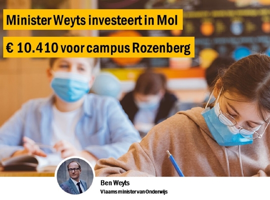 Vlaams minister van Onderwijs Ben Weyts investeert € 10.410,05 in campus Rozenberg van het Katholiek Secundair Onderwijs (KSOM) in Mol. “We timmeren verder aan een betere onderwijskwaliteit voor onze leerlingen”, zegt Weyts. “Die onderwijskwaliteit krikken we mee op door te investeren in onze schoolinfrastructuur.” Deze subsidie geeft Rozenberg de mogelijkheid om noodzakelijke investeringen uit te voeren en stappen te zetten naar een meer duurzame school”, zegt Schepen van Onderwijs Hilde Valgaeren.